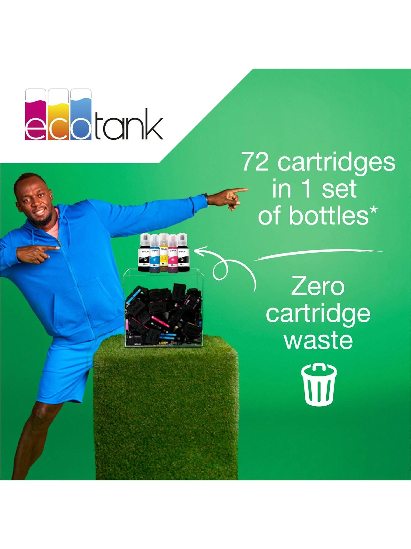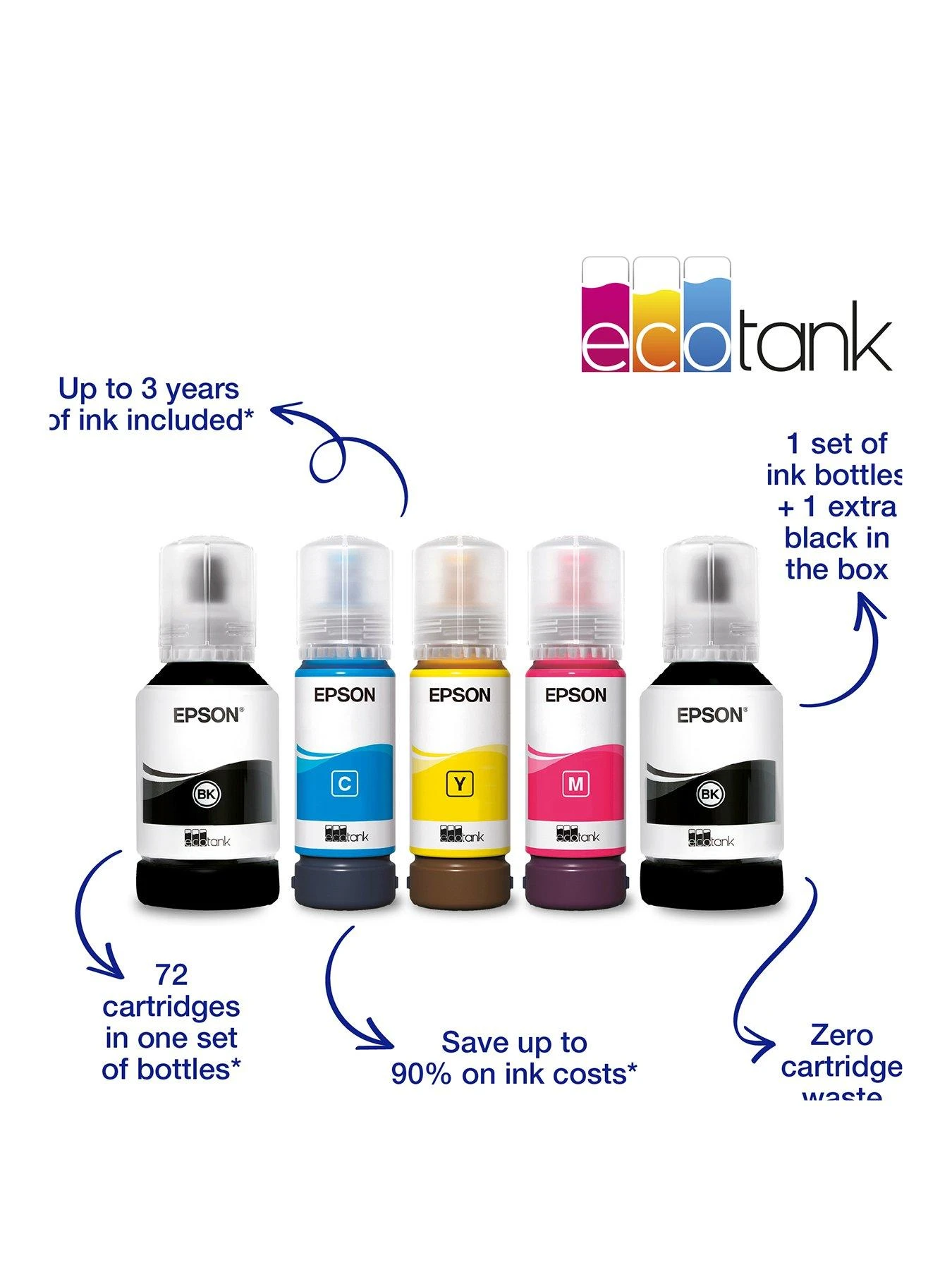This economical printer saves you up to 90% on printing costs and comes with an extra black ink bottle for up to 3 years’ worth of ink included in the box. One set of ink bottles delivers up to 7,500 pages in black and 6,000 in colour, equivalent of up to 72 cartridges worth of ink!
