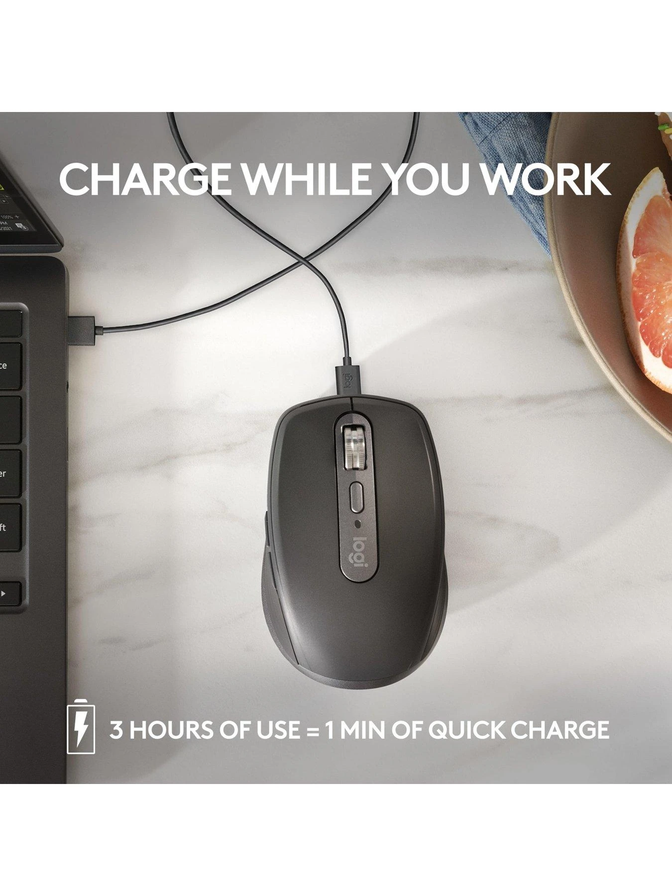 MX Anywhere 3S stays powered up to 70 days on a full charge(3) – and delivers three hours of use from a one minute quick charge.